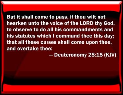 However, if you do not obey the LORD your God and do not carefully follow all his commands and decrees I am giving you today, all these curses will come on you and overtake you. — Deuteronomy 28:15