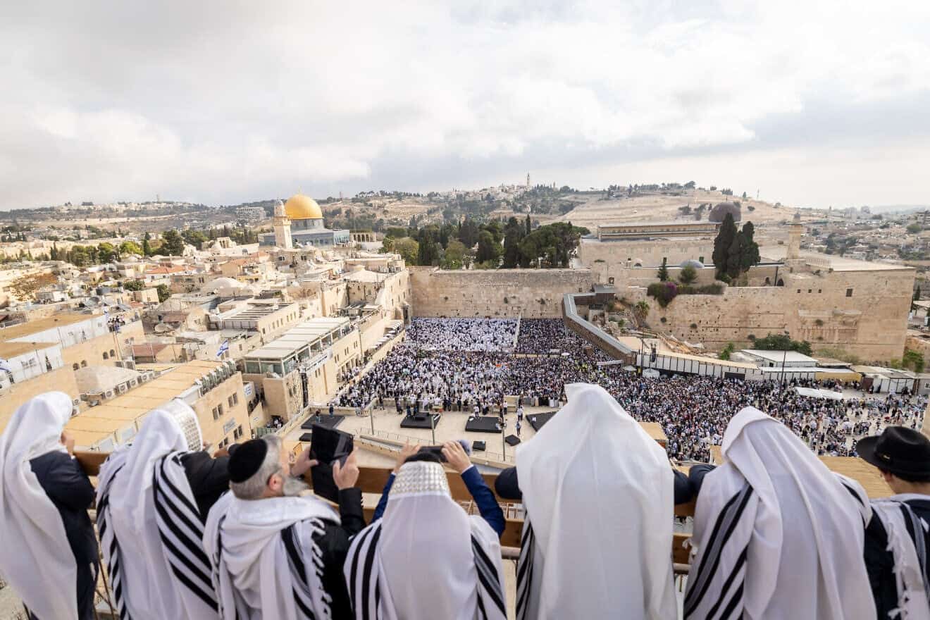 Jewish worshippers pray at the Western Wall, Judaism’s holiest prayer site, in Jerusalem’s Old City, during the Cohen Benediction priestly blessing at the Jewish holiday of Sukkot, Oct. 9, 2025. Photo by Chaim Goldberg/Flash90.