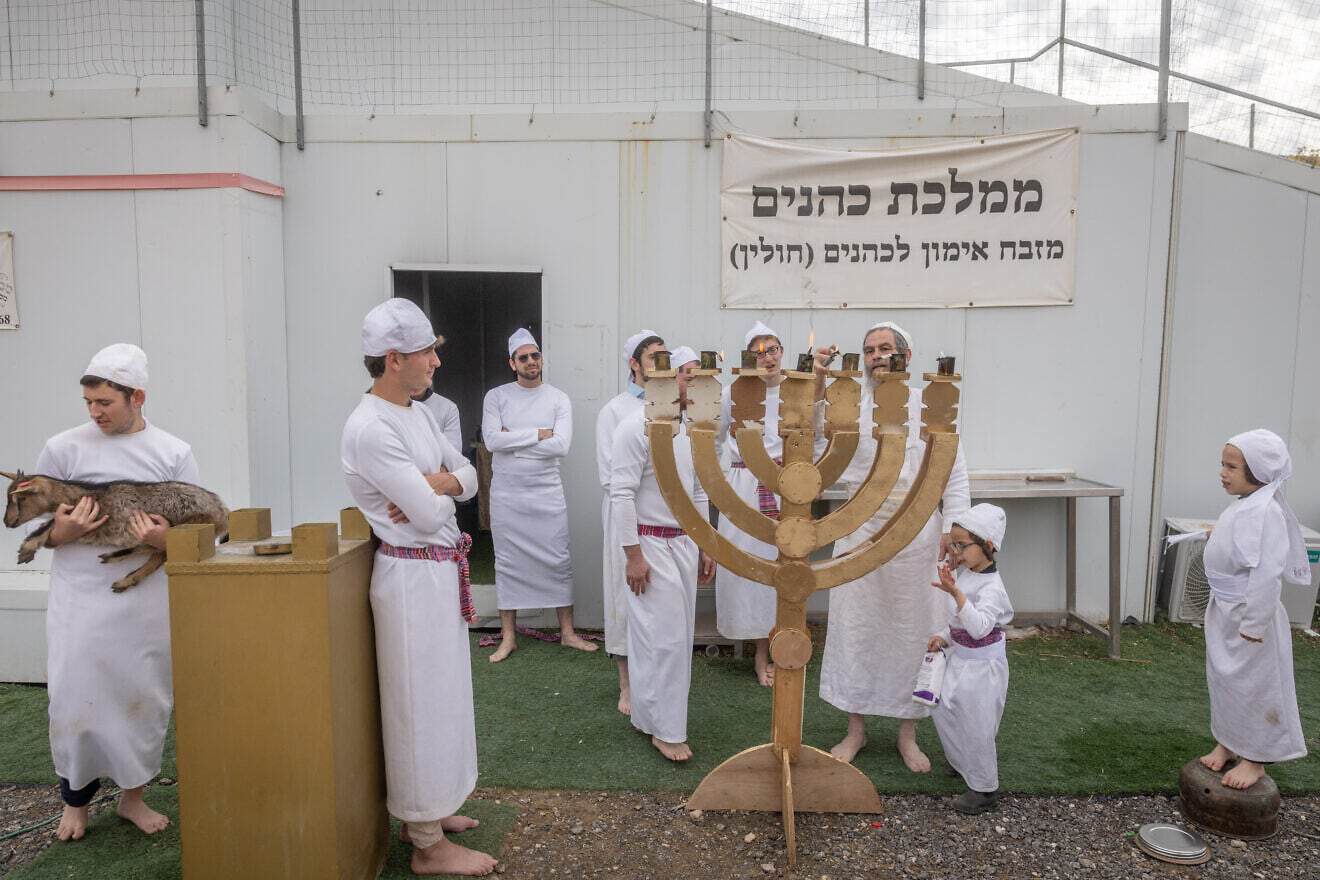Jewish priests (Kohanim) practice in rituals on an altar built to the original dimensions of the Temple altar according to Jewish tradition, at the Letchila Haredi Farm near Ma’ale Adumim, in Judea and Samaria, Dec. 21, 2025. Photo by Chaim Goldberg/Flash90.