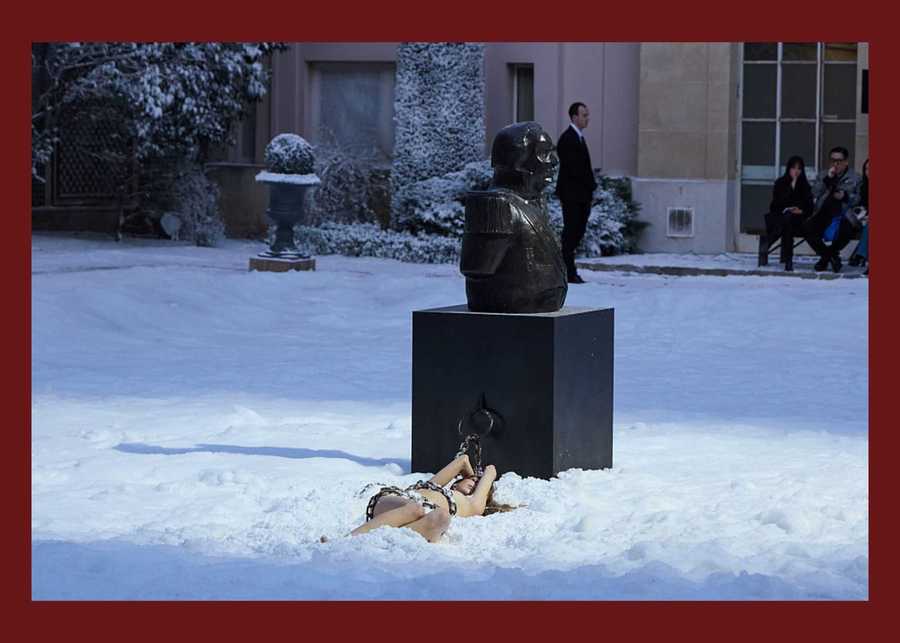 But if that wasn’t convincing enough, the performance also included a nearly nude model bound and chained to an obsidian statue of a man’s head in a theatrical exaltation of bondage, captivity, and ritualistic sacrifice.